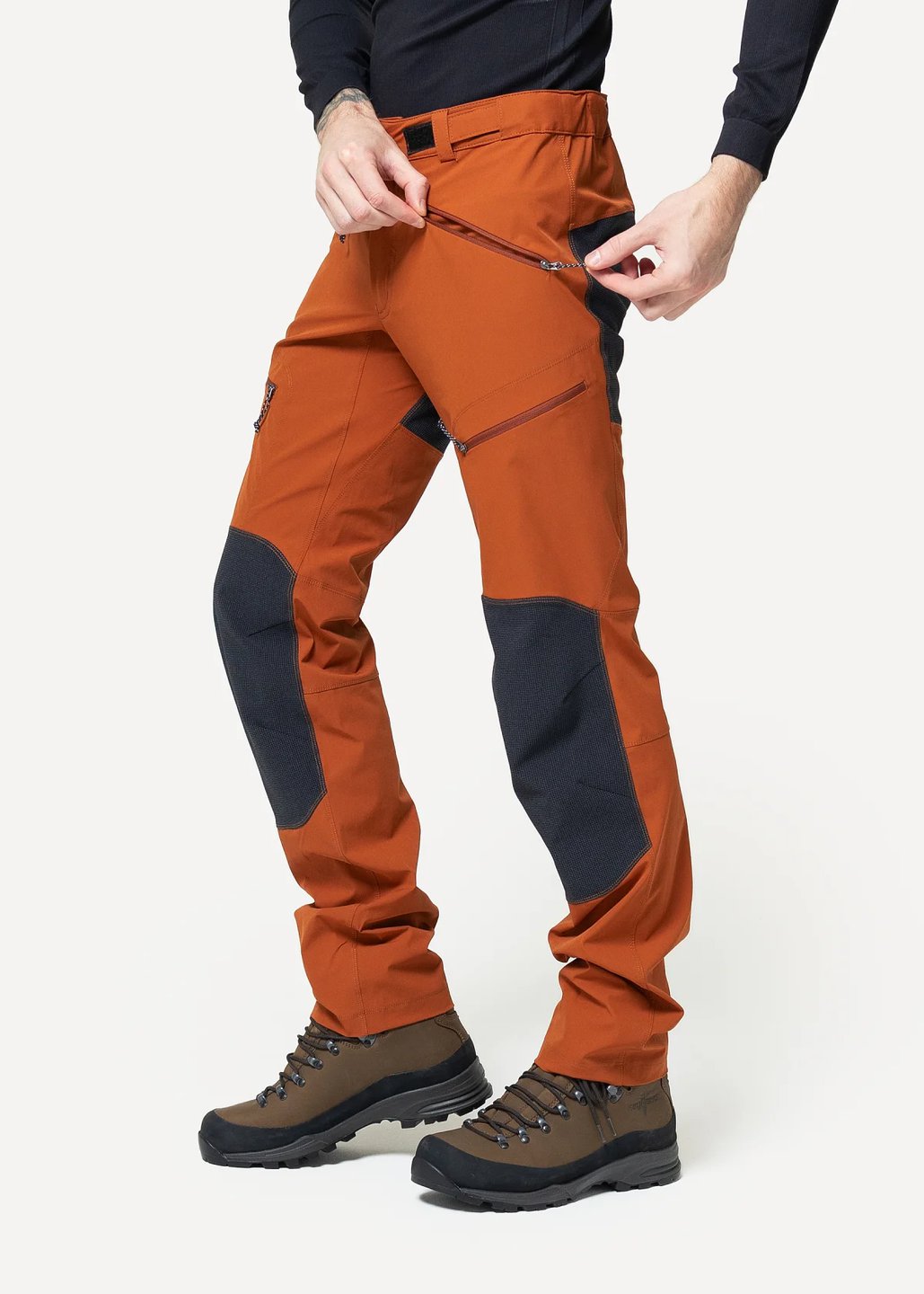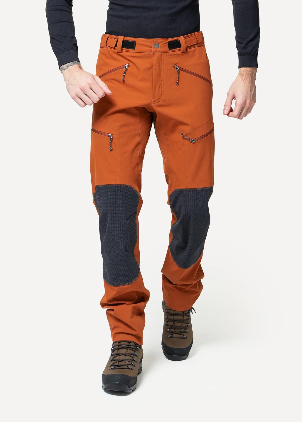 Дополнительно усиленная эластичная ткань на коленях и области сидения, полностью совместимые со страховочной системой карманы и регулируемый пояс – функциональные элементы технических штанов, полезность которых трудно переоценить.