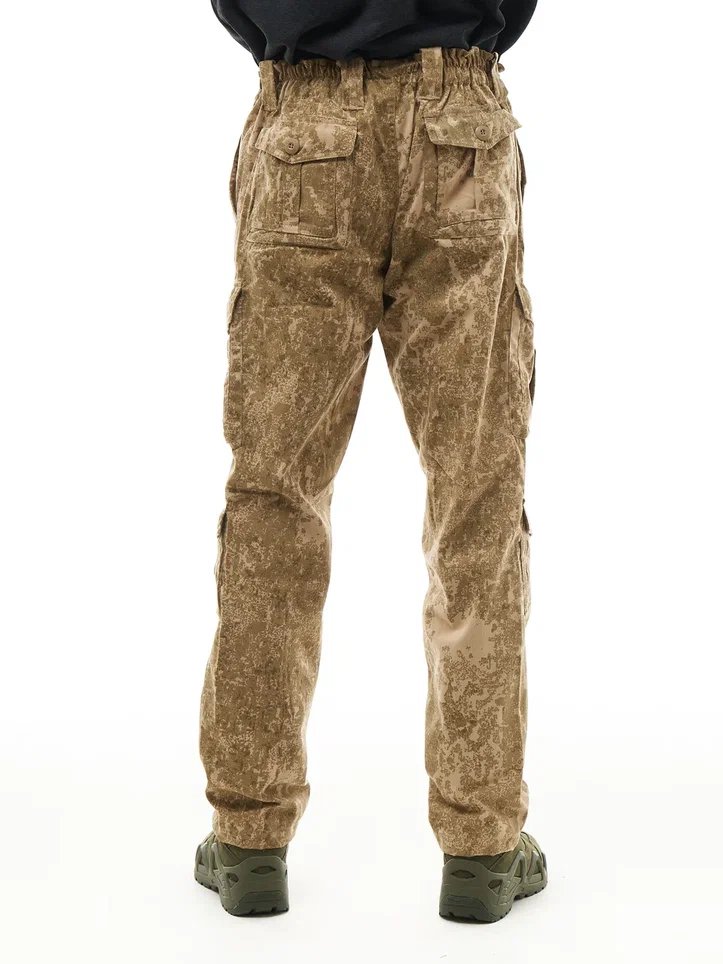 Брюки с боковыми карманами с фигурным входом. Ниже расположены накладные объемные карманы с клапаном, под ними накладные объемные карманы меньшего размера. По низу ширина брюк регулируется кулисой .Пояс со шлевками и резинков по задней части пояса. На задней половинке брюк расположены накладные карманы с клапаном.