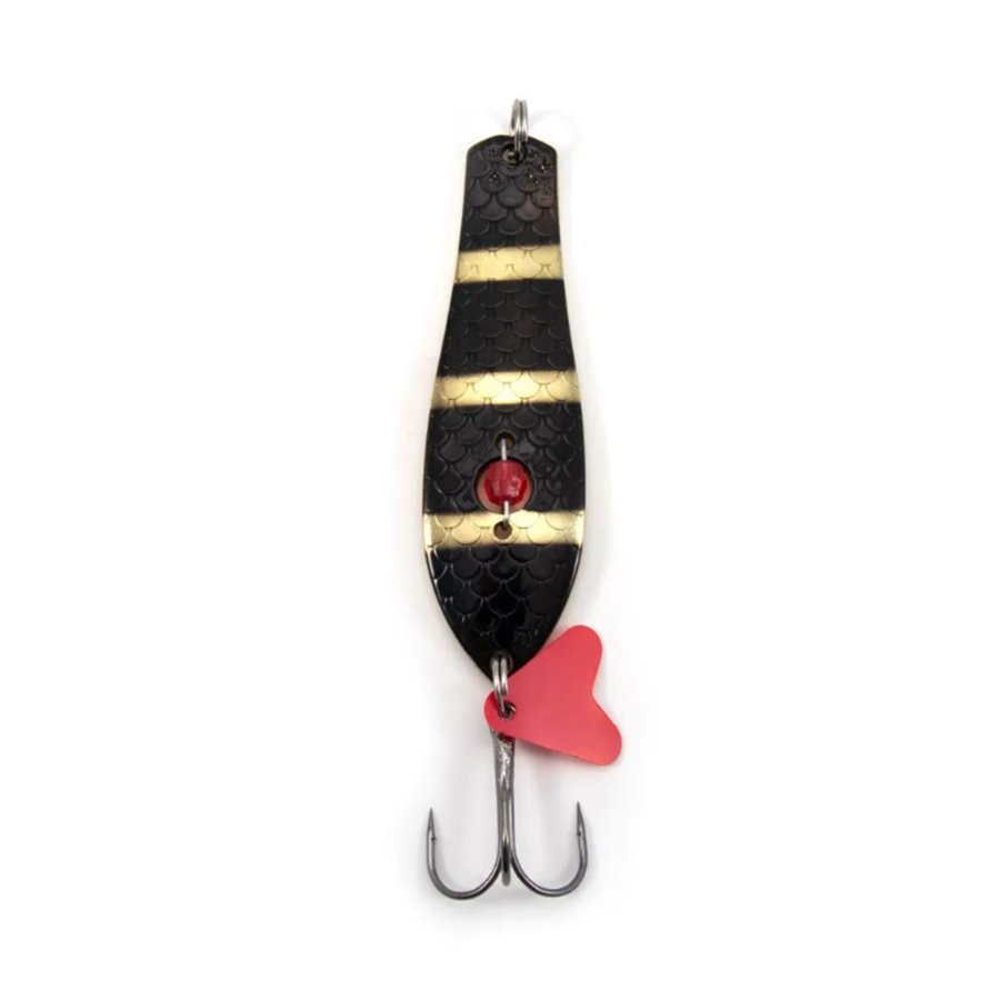 Имеет подвижную, яркую пластинку, напоминающую плавники, что дополнительно привлекает щуку и другого хищника. Приманка оснащена тройным острым крючком.