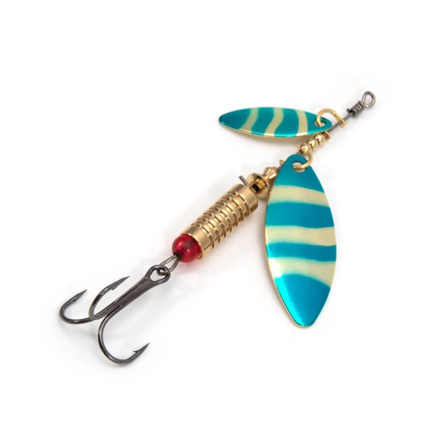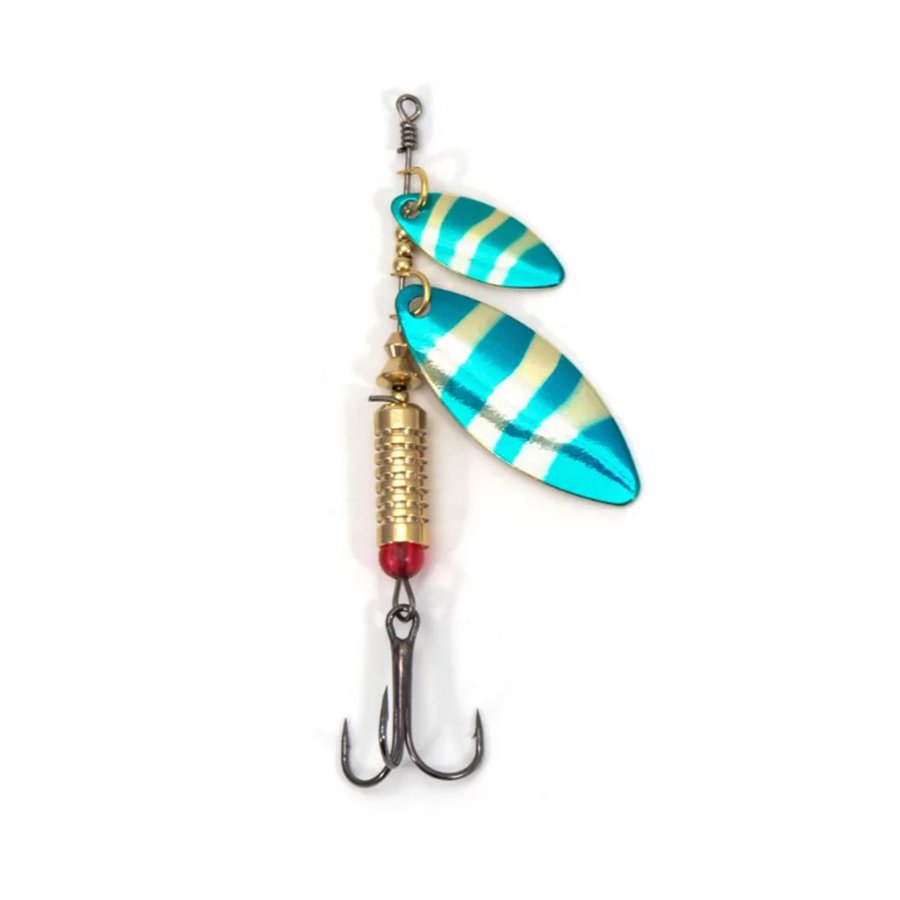 Главный элемент блесен Namazu «Ahimonda» – два узких, вытянутых вращающихся лепестка, начинающие свою работу, сразу как блесна начинает движение. Удвоенное количество лепестков обеспечивает дополнительные сигналы, что повышает интерес к блесне даже хитрой рыбы.
