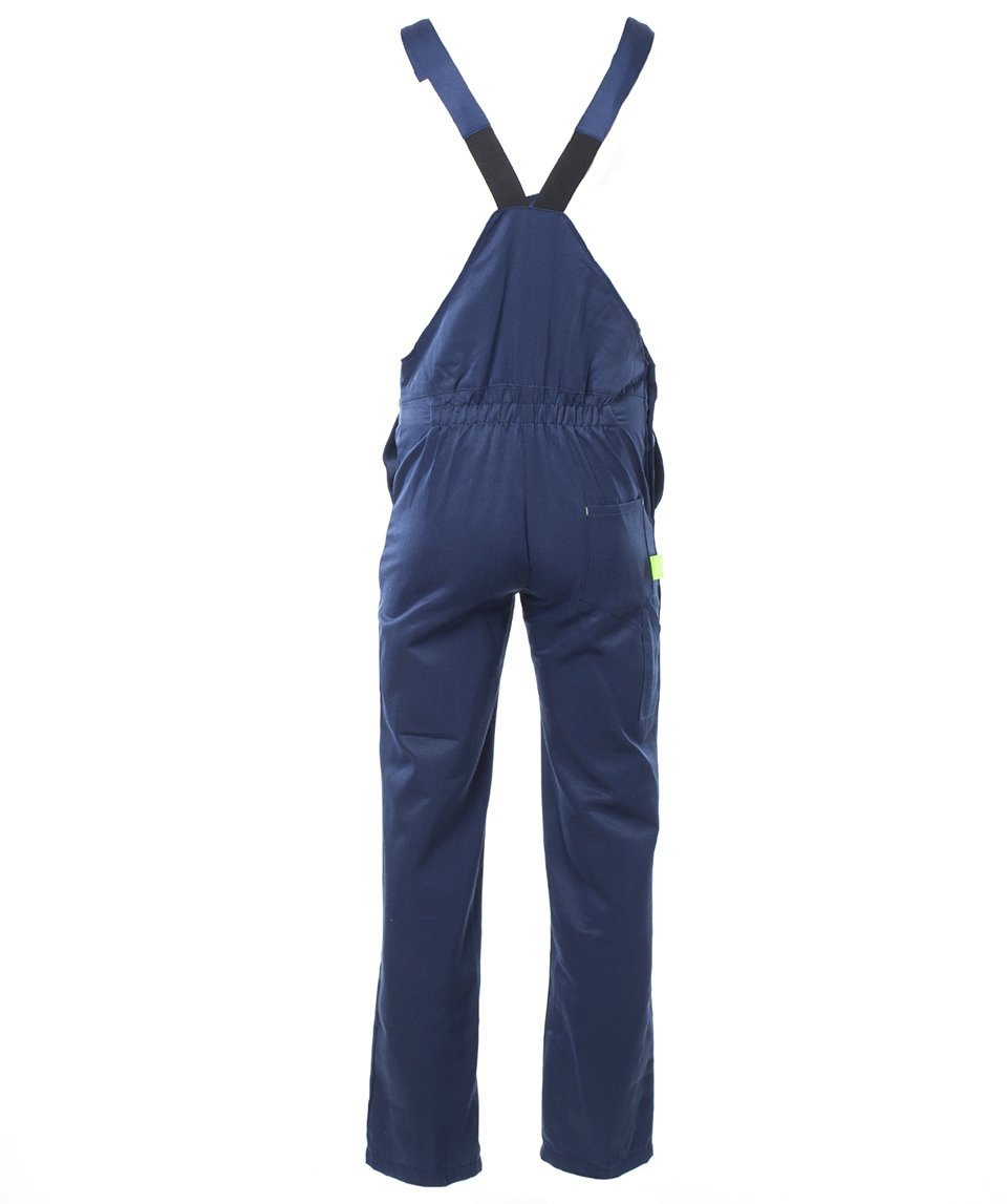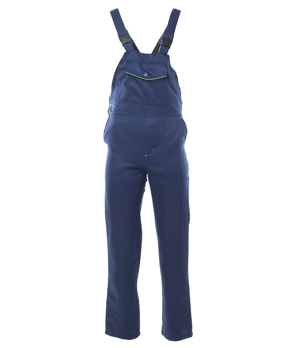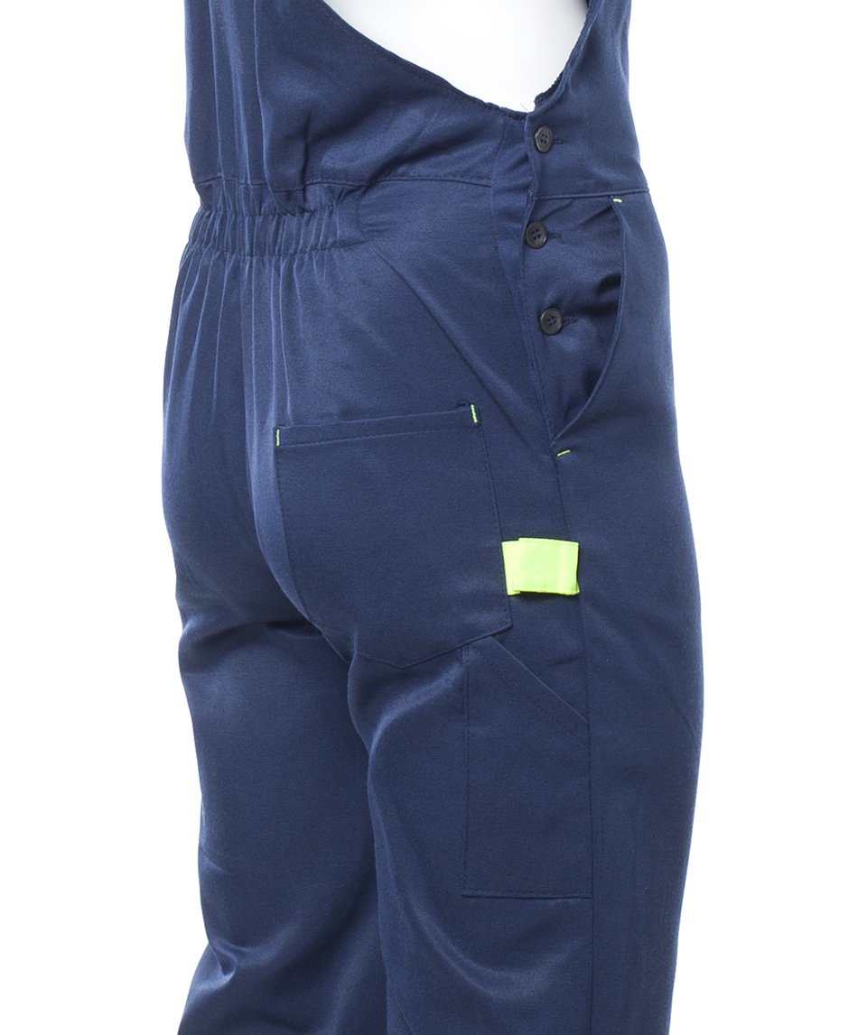 Полукомбинезон закрывается пуговицами и оснащен накладными карманами. Отделка клапанов карманов, воротника и другие декоративные элементы яркого контрастного цвета.