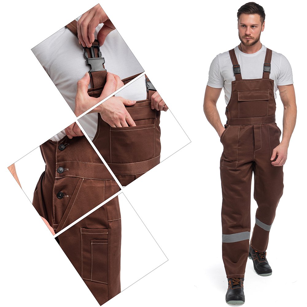 Полукомбинезон оснащен различными многофункциональными карманами для хранения мелочей. Эластичная резинка по талии спинки фиксирует посадку. Гульфик застегивается на молнию, в правом боковом шве на пуговицы. Бретели на пластиковых застежках (фастексах), регулируются по длине за счет эластичной резинки.