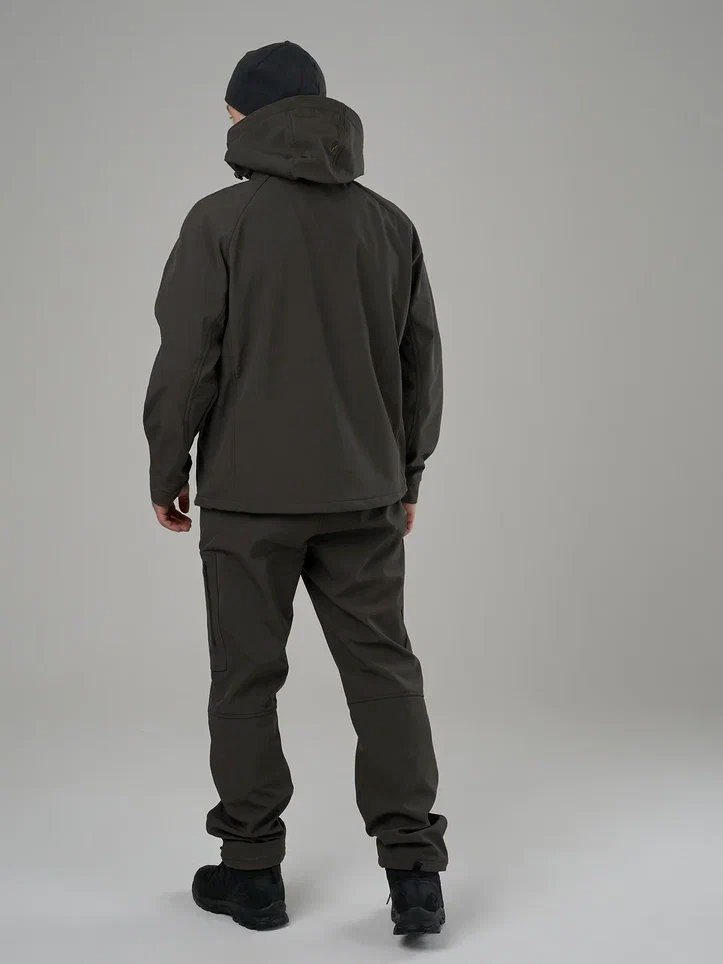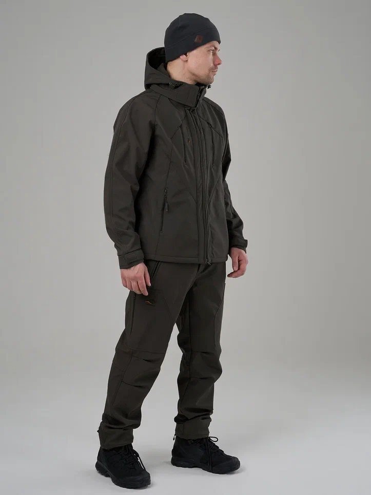 Костюм выполнен из софтшелла — это трехслойный материал, верхний слой которого гладкий, он прост в уходе, и обладает высокой прочностью. Внутренний слой - это мягкий флис с отличными теплосберегающими характеристиками. Средний слой в материале софтшелл - это мембрана, которая обеспечивает защиту от осадков и ветра.
