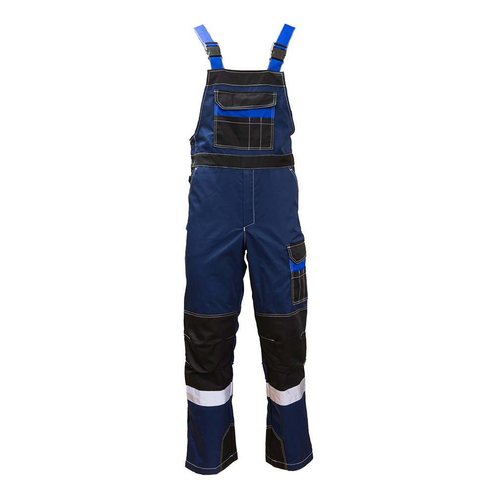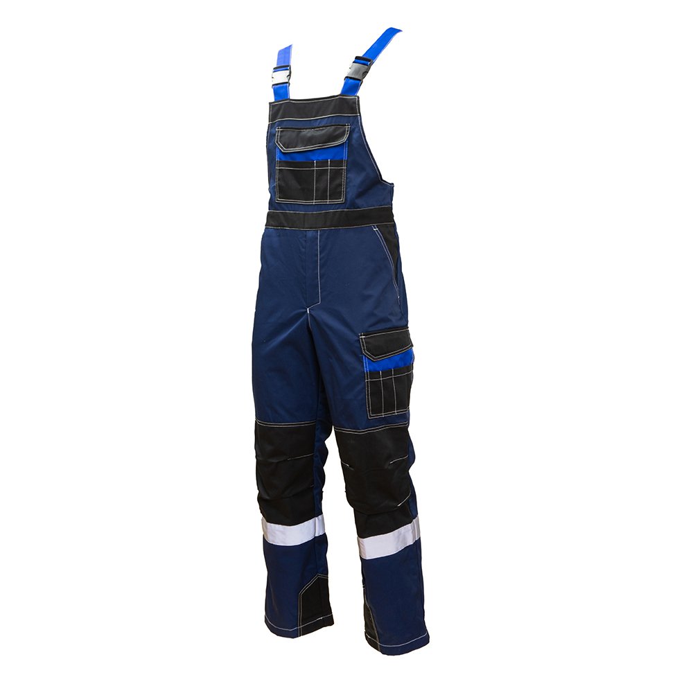 Объемные накладки темного цвета, с вытачками в области колена. В полукомбинезоне усилительные накладки по шаговым швам.