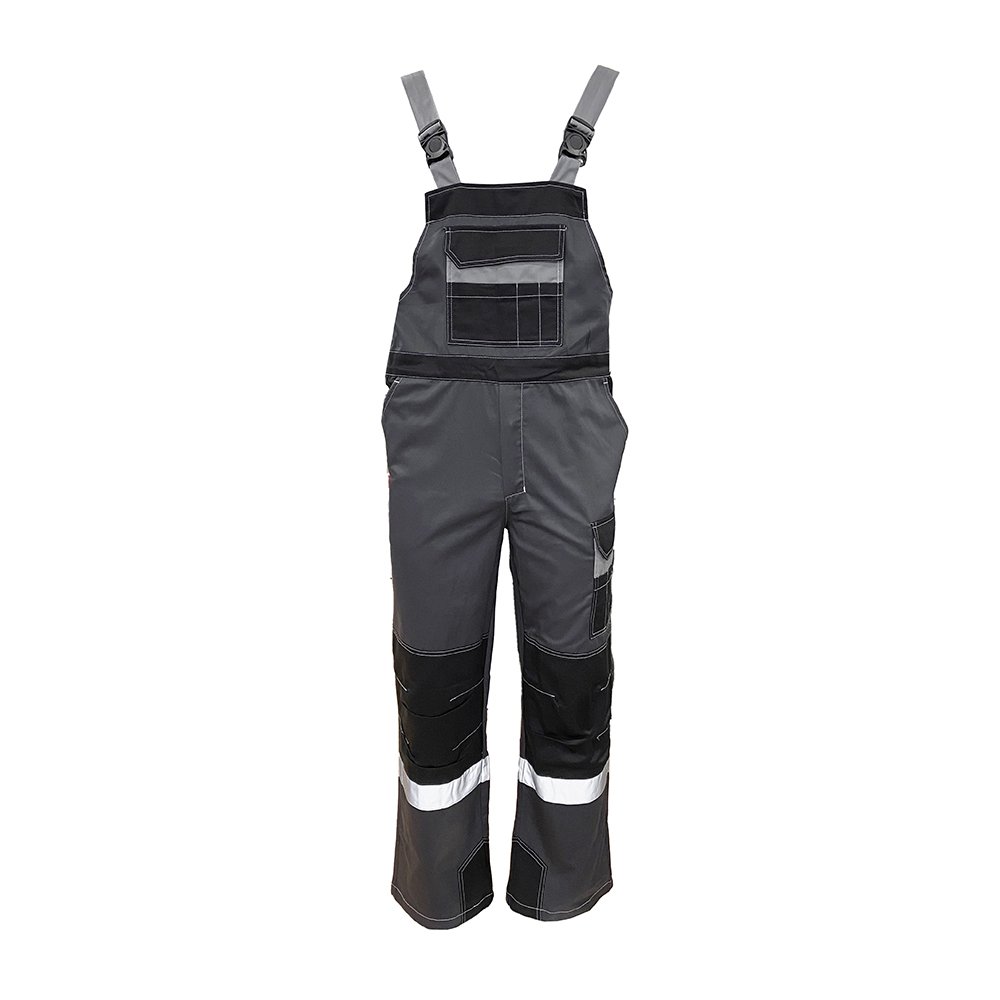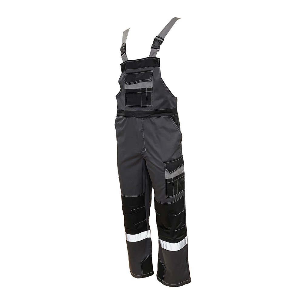 Объемные накладки темного цвета, с вытачками в области колена. В полукомбинезоне усилительные накладки по шаговым швам.