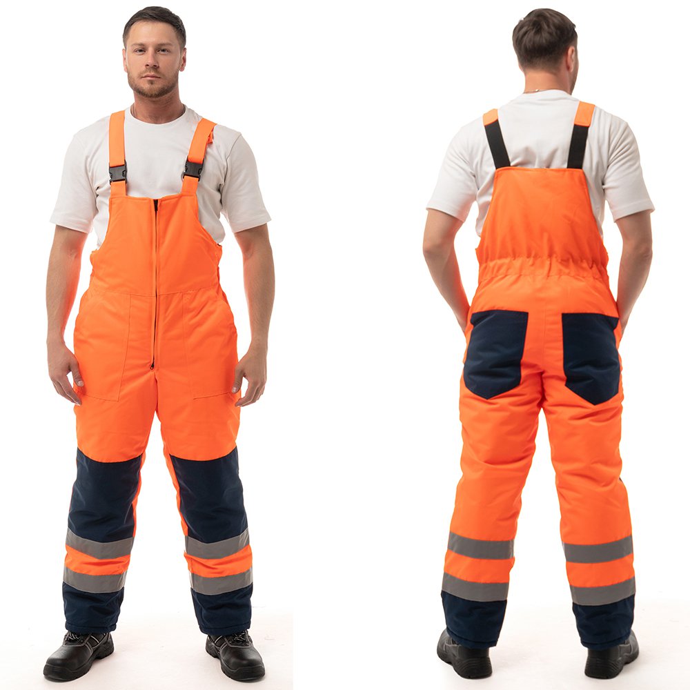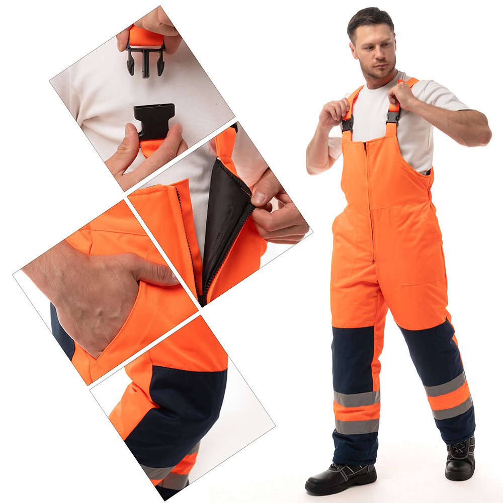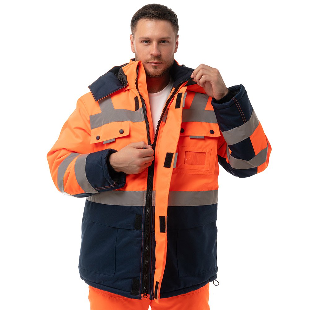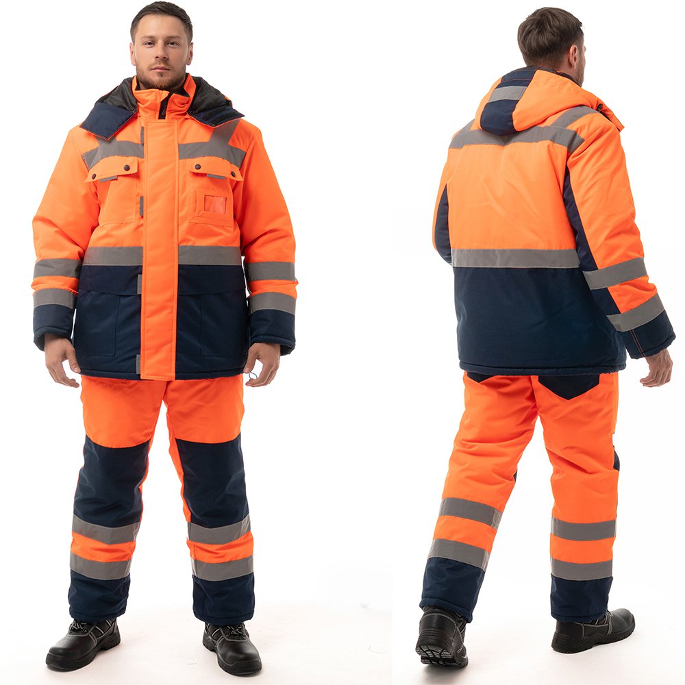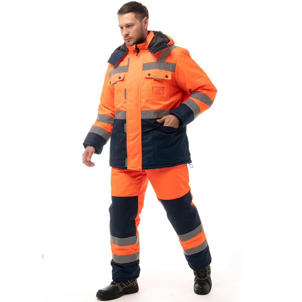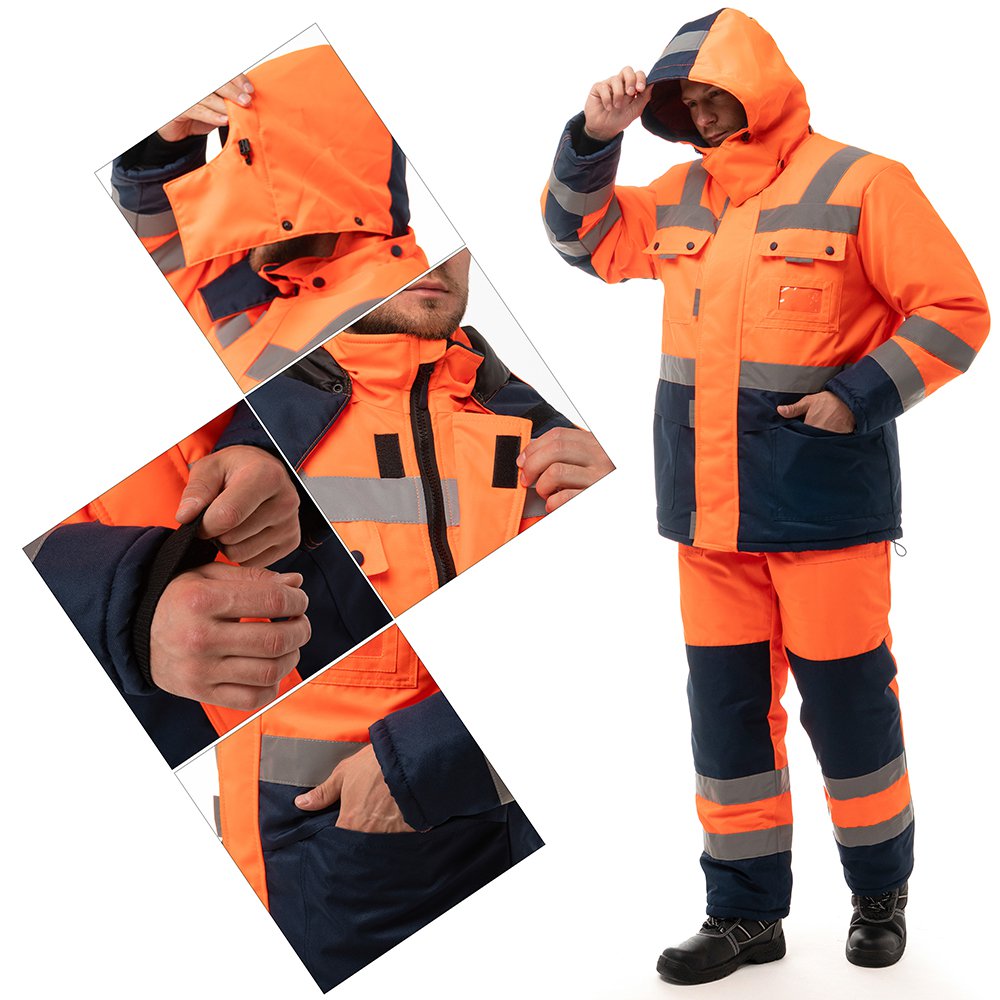 - Для безопасной работы сотрудника в местах с плохим освещением на костюме предусмотрена световозвращающая лента в 2 ряда.