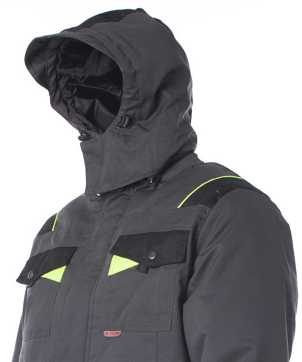 - Костюм оснащен съемным капюшоном, который можно регулировать по объему лицевой и затылочной части и использовать с каской.