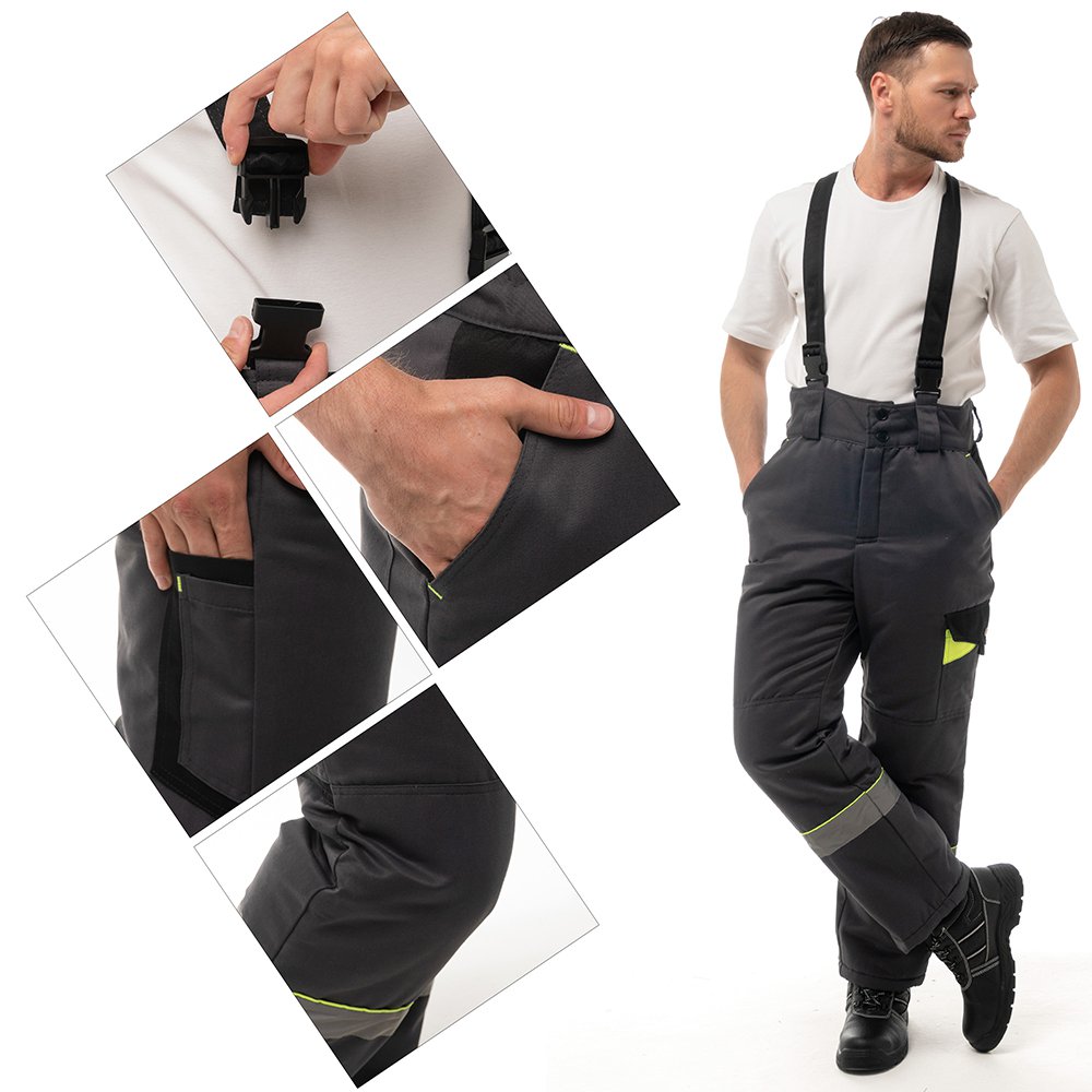 - На брюках съёмные бретели, широкий утепленный пояс закрывается на пуговицы.