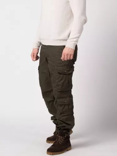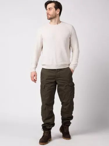 Брюки с боковыми карманами с фигурным входом. Ниже расположены накладные объемные карманы с клапаном, под ними накладные объемные карманы меньшего размера. По низу ширина брюк регулируется кулисой. Пояс со шлевками и резинков по задней части пояса. На задней половинке брюк расположены накладные карманы с клапаном.