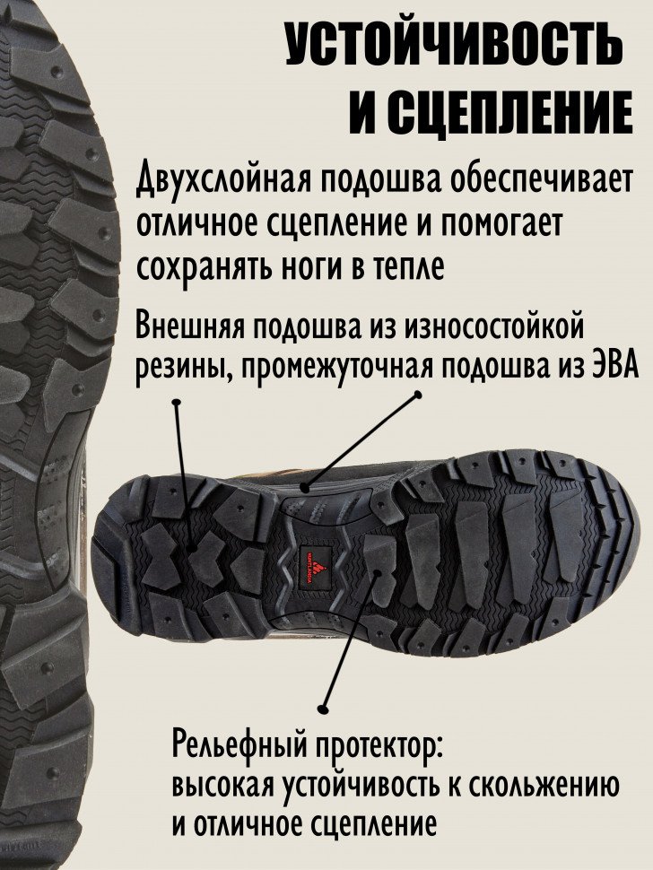 Двухслойная подошва обеспечивает отличное сцепление и помогает сохранять ноги в тепле. Внешняя подошва из износостойкой резины с рельефным протектором обеспечивает высокую устойчивость к скольжению и отличное сцепление на пересеченной местности. А амортизационные свойства промежуточной подошвы из ЭВА защищают суставы, смягчая ударные нагрузки и снижая усталость.