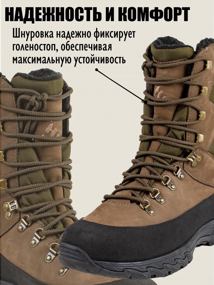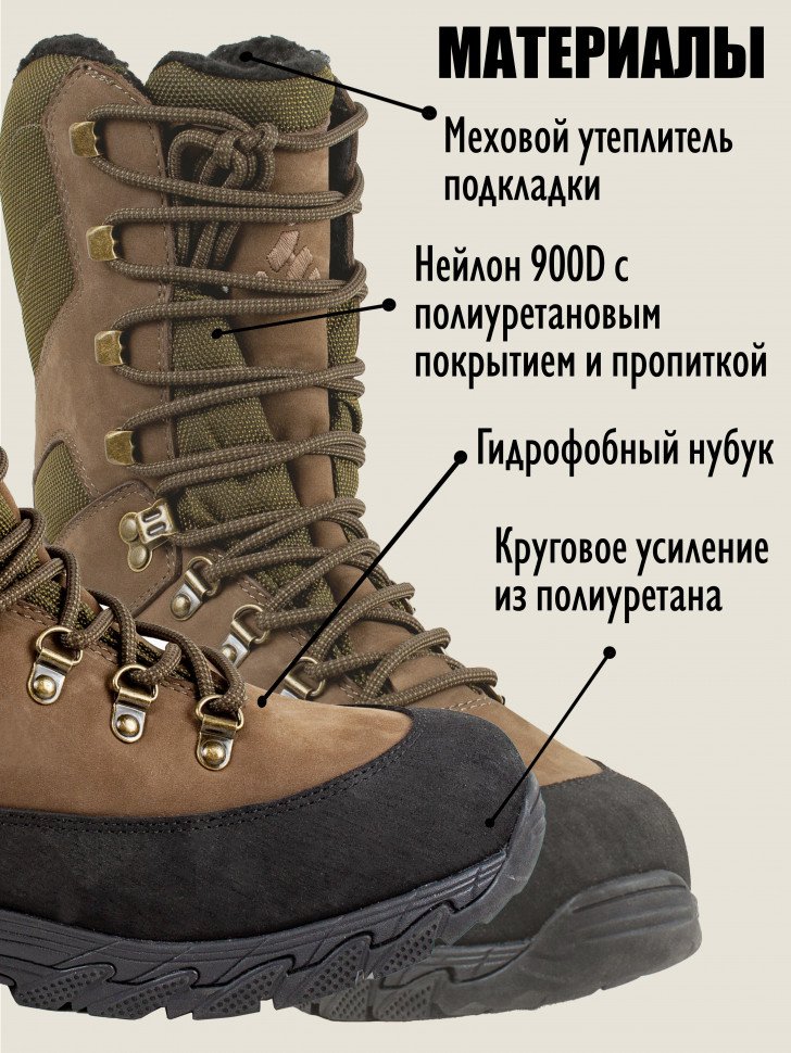 Верх ботинок выполнен из гидрофобного нубука. Он не вызывает аллергии и обладает хорошей пароотводностью за счет сохранения структуры пор. Оголовье из влагоустойчивого аналога кордуры с практически теми же характеристиками – нейлона 900D с полиуретановым покрытием и водоотталкивающей пропиткой. Этот технологичный материал обладает высокой прочностью, устойчивостью к износу и разрывным нагрузкам.