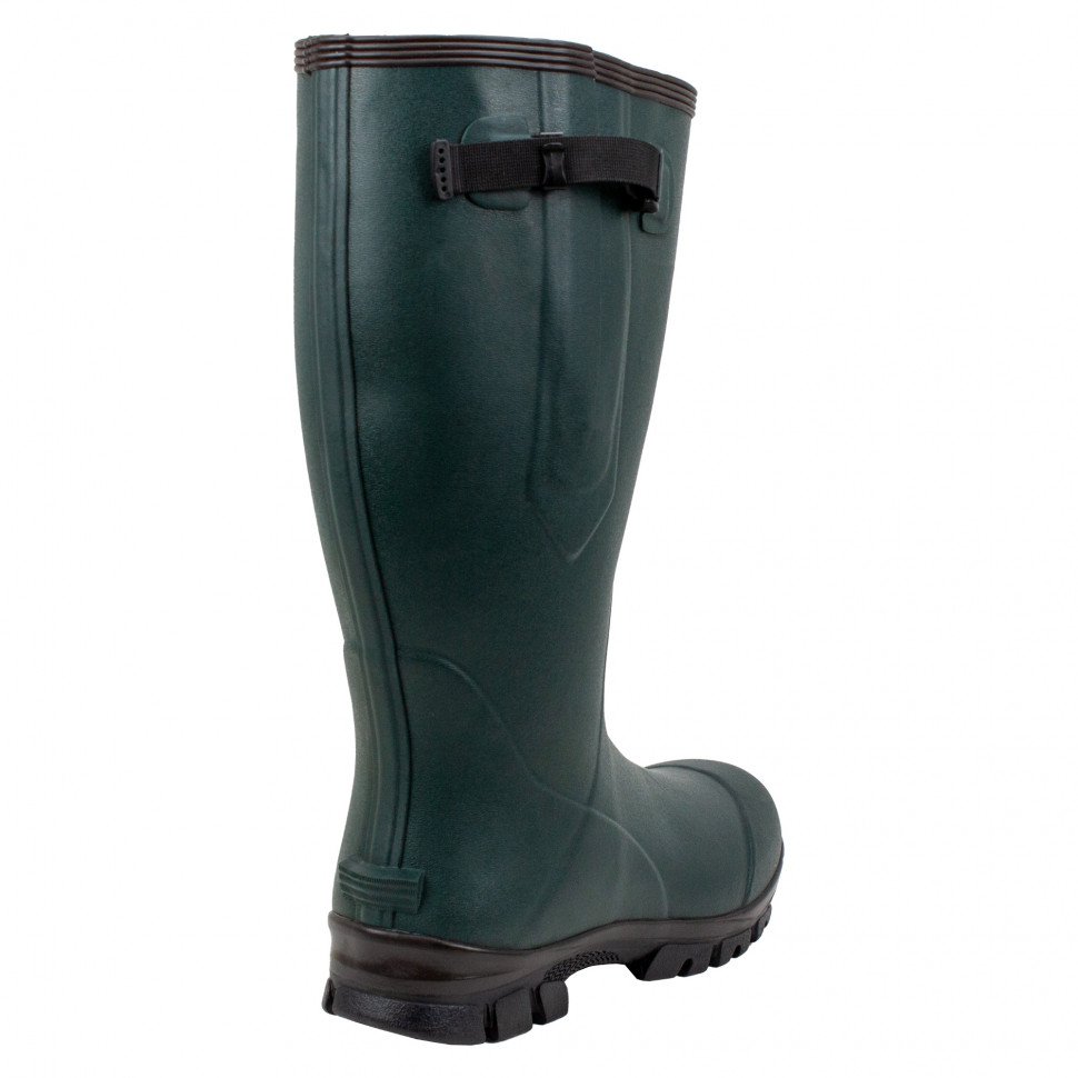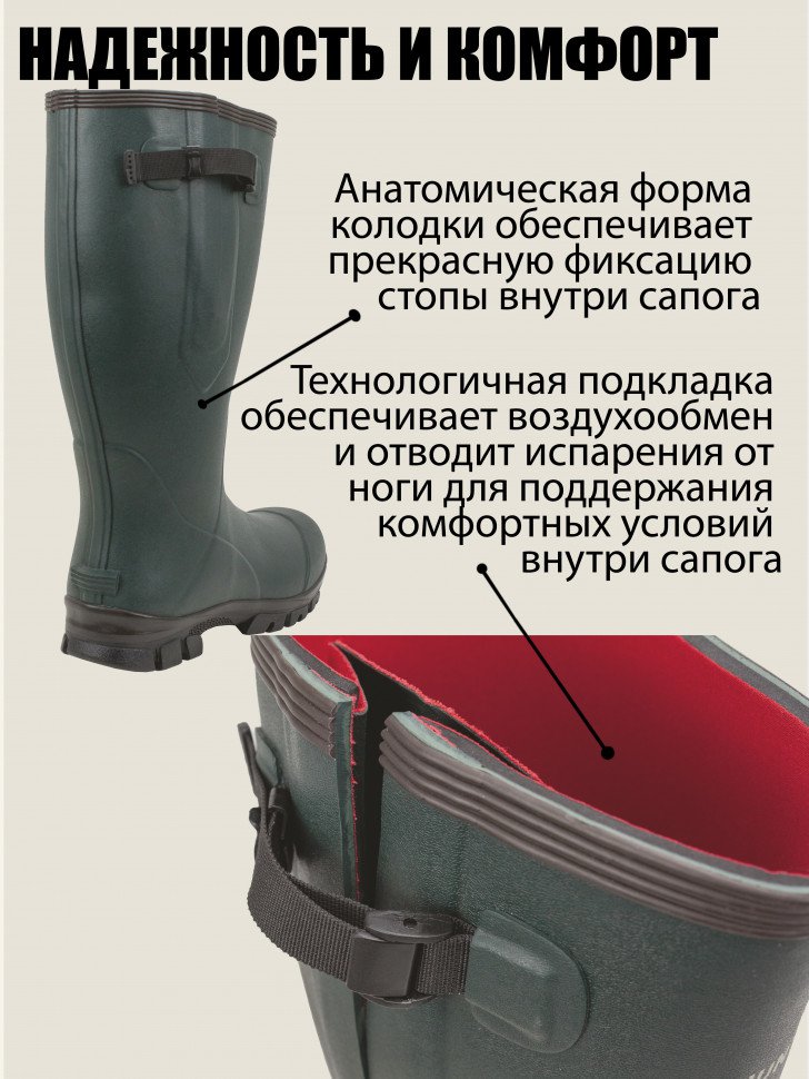 Эти сапоги отлично подходят для интенсивного движения с сохранением максимального комфорта. Гибкое голенище герметичной конструкции изготовлено из прочной резины. Для комфортной посадки на ногу с широкой голенью объем голенища регулируется расширительным клапаном в верхней его части. Анатомическая форма колодки обеспечивает прекрасную фиксацию стопы внутри сапога. Нога не выскочит из сапога даже при засасывании в сильную грязь.
