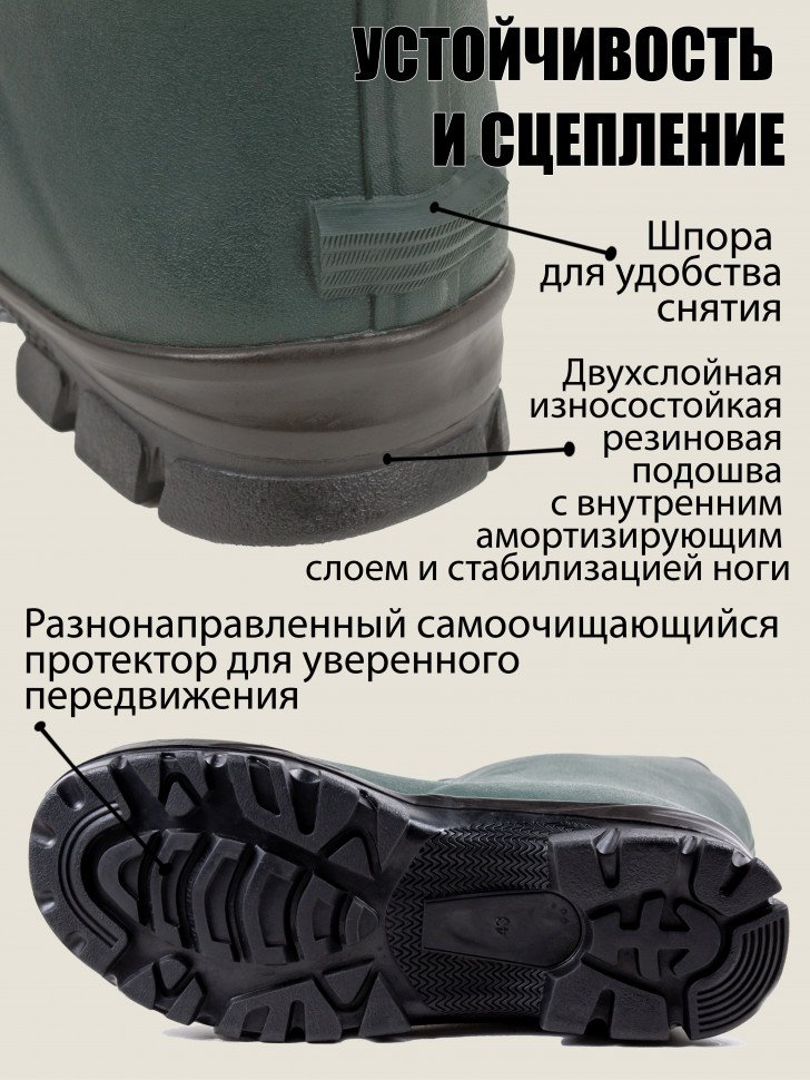 - Двухслойная износостойкая резиновая подошва с внутренним амортизирующим слоем и стабилизацией ноги