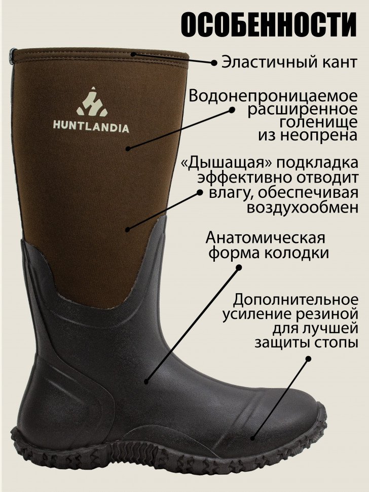 Сапоги Huntlandia Bot не боятся сложных условий. Нижняя часть сапога выполнена из прочной износостойкой резины, защищающей ноги от воды, грязи и механических повреждений. В области носка и пятки усилена толщина материала, что обеспечивает дополнительную защиту от ударов о камни и ветки. Это особенно важно при ходьбе по пересеченной местности, во время охоты или рыбалки.
