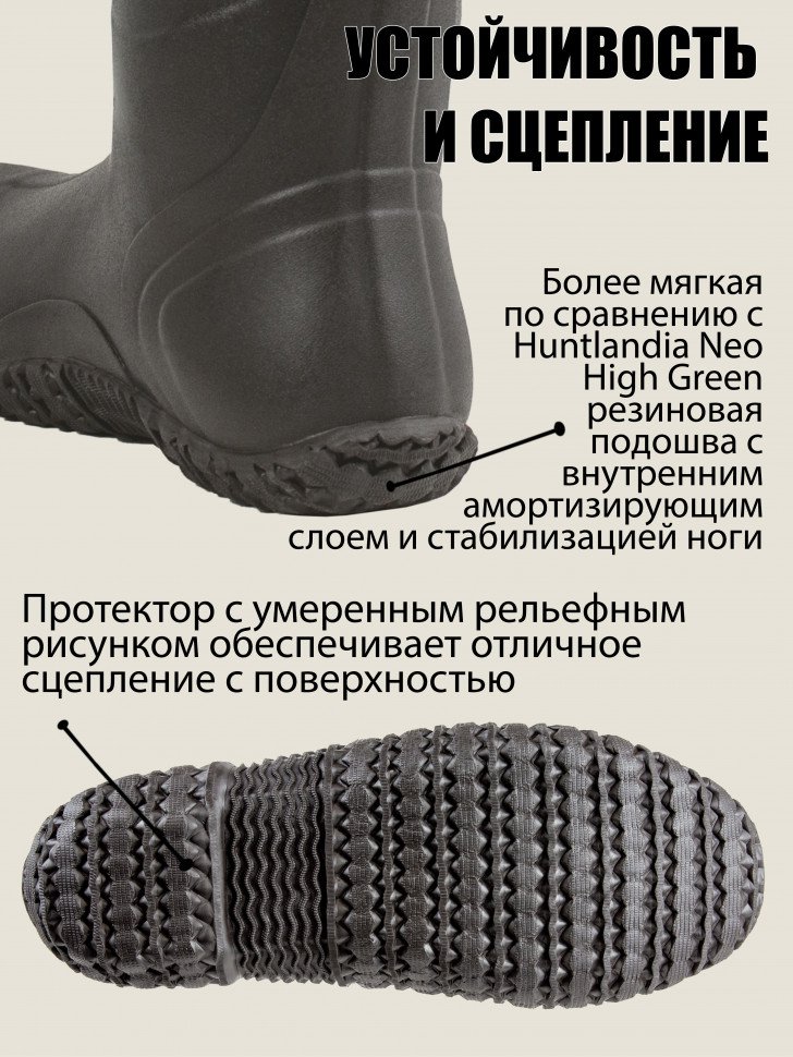 Протектор с умеренным рельефным рисунком на более мягкой по сравнению с Huntlandia Neo High Green резиновой подошве гарантирует отличное сцепление с поверхностью. Неглубокий протектор хорошо подходит для движения по мягким лесным тропам. Высокое расширенное голенище надежно защищает ноги от влаги и грязи, позволяя комфортно чувствовать себя в любых погодных условиях.