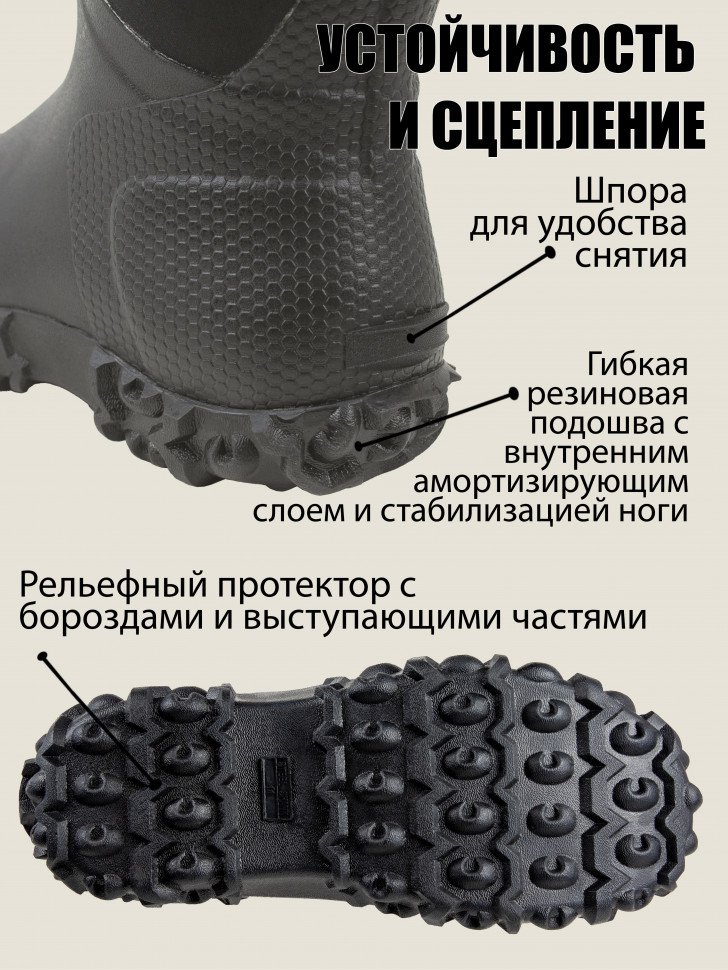 Нижняя часть выполнена из износостойкой резины, что обеспечивает надежную защиту от воды и различных повреждений. Усиленные участки в районе носка и пятки защищают ноги от ударов о камни и ветки, что особенно важно в условиях охоты и рыбалки.