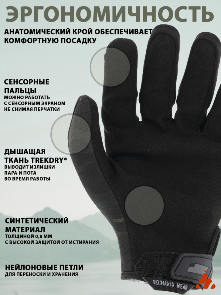 - Хорошо вентилируемая, "дышащая" верхняя поверхность перчаток из влагоотводящего материала TrekDry®