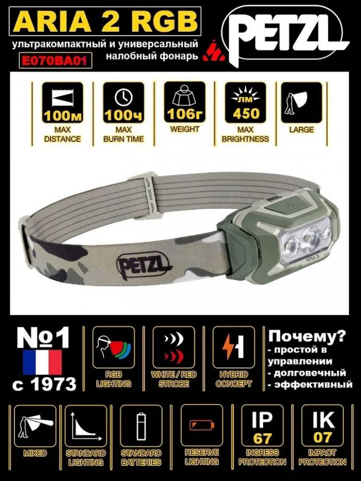 Фонарь налобный тактический Petzl Aria 2 RGB (450 лм) камуфляж