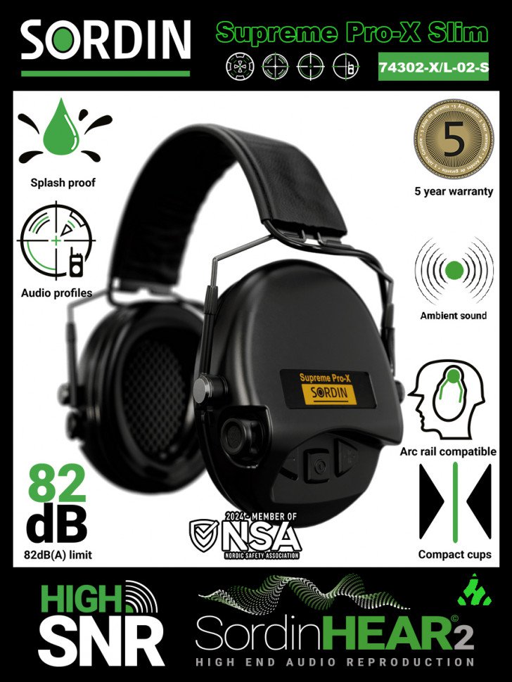 Серия наушников Sordin Supreme Pro-X поставляется с усовершенствованной звуковой системой SordinHEAR2, которая включает в себя четыре звуковых профиля, каждый из которых соответствует типичной пользовательской ситуации, с которой могут столкнуться охотники или стрелки. Компактная конструкция чашек делает Supreme удивительно комфортным в носке. Нижняя часть чашечек еще более компактна, что упрощает стрельбу как для правшей, так и для левшей.