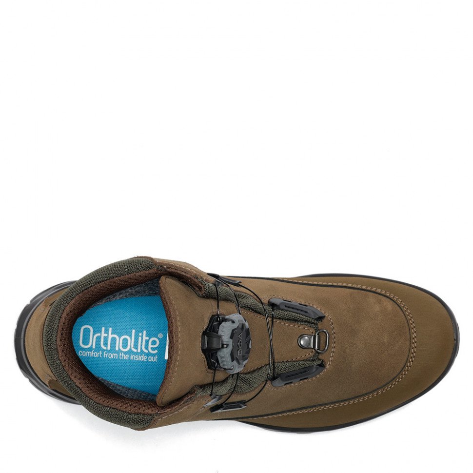 Верх ботинка выполнен из водостойкого спилка. Натуральная кожа не вызывает аллергии и обладает хорошей пароотводностью за счет сохранения структуры пор. Оголовье из водонепроницаемой кордуры. Этот материал с особой структурой, многоуровневым полиуретановым покрытием и гидрофобной пропиткой в свое время был разработан для армии. Он дополнительно отталкивает частицы воды, отводит излишки тепла и облегчает чистку обуви.