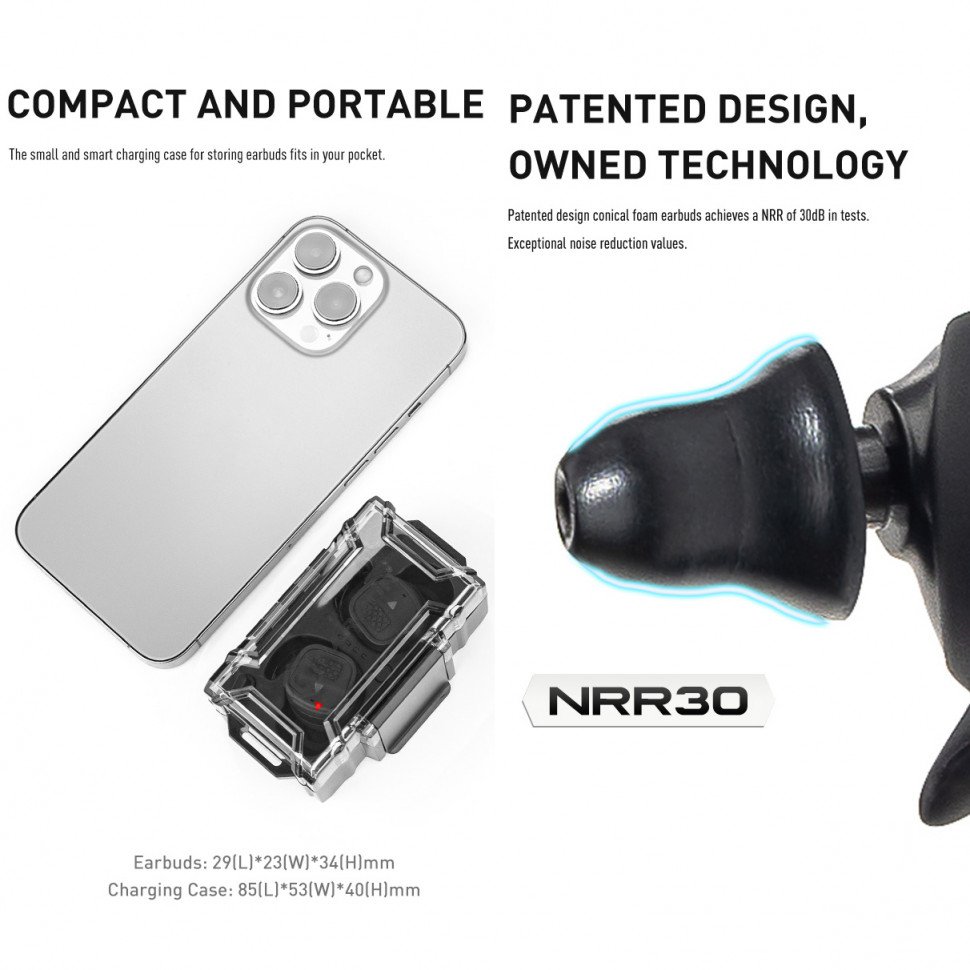 Беруши обладают высокой скоростью срабатывания, обеспечивают обработку сигнала до 1 мс. Обеспечивают коэффициент подавления шума NRR 30 дБ.