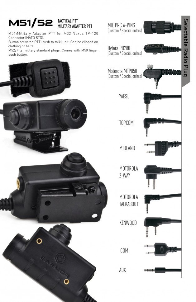 Кнопка-адаптер M52 PTT совместима с активными наушниками Earmor, а так же с активными наушниками (MSA Sordin, 3M Peltor и аналогичные), что позволяет использовать систему связи в условиях повышенного шума или в зоне военных действий. Влагозащищенная.