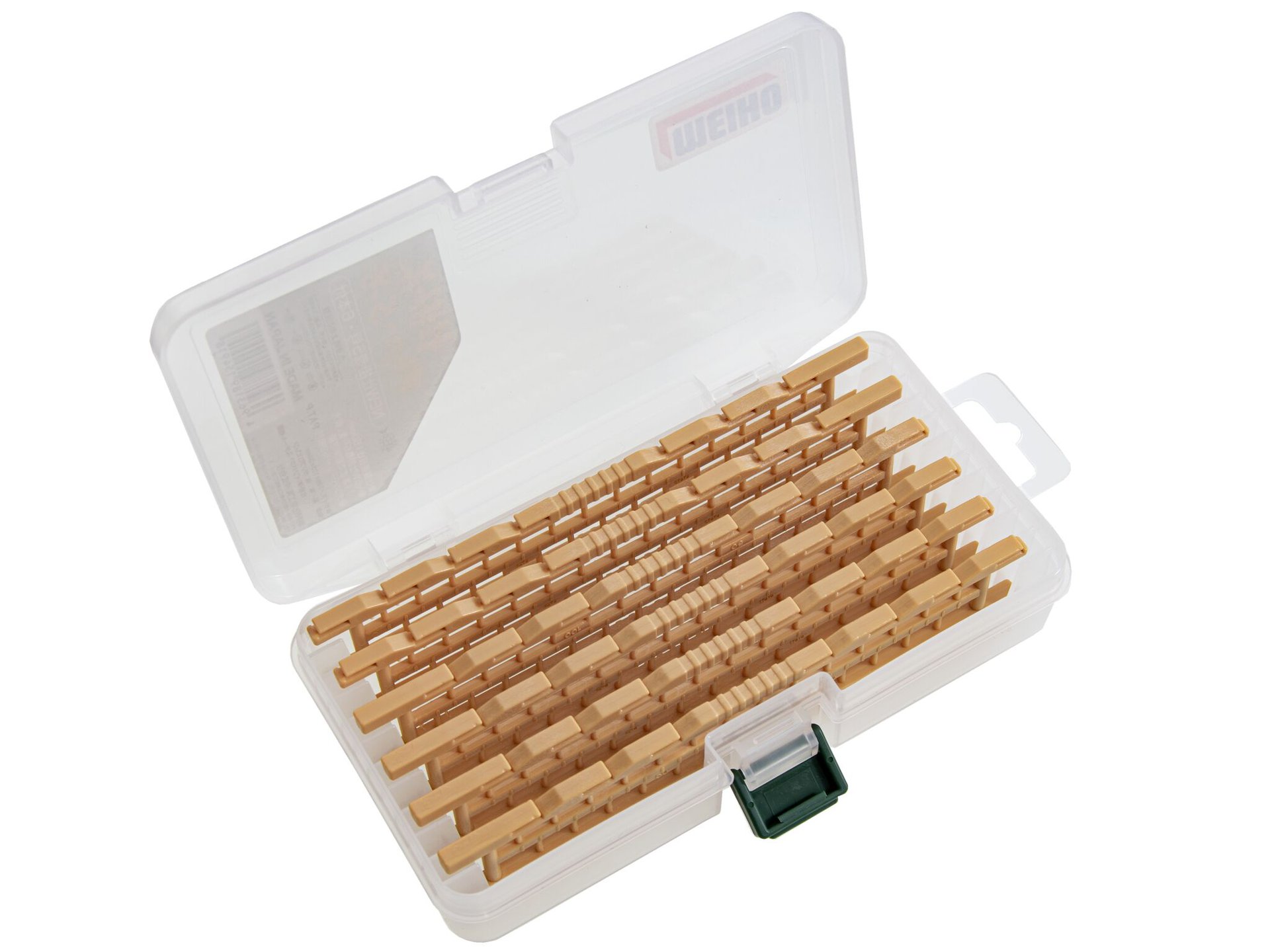 На внутренних стенках коробки предусмотрены направляющие, выполняющие роль пазов для мотовил. Это обеспечивает правильное хранение и транспортировку снаряжения, предотвращая поломку поплавков и спутывание лески. Прозрачная крышка позволяет быстро определить, в какой из коробок находится необходимая оснастка.