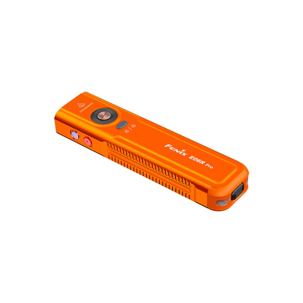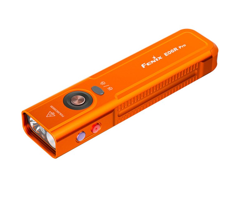 Fenix E06R Pro оснащён несколькими видами света для разных задач. Белый дальний свет с чётким сфокусированным лучом,нейтральный ближний — с мягким рассеянным освещением; при необходимости их можно использовать одновременно в комбинированном режиме. Также в фонаре есть ультрафиолетовый свет, для проверки документов, ремонта техники и других специфических задач, красный свет — для работы в темноте без потери ночного зрения, и RGB-подсветка, которую можно использовать как сигнальную или декоративную. Дополняет функциональность красный лазер, позволяющий точно указывать объекты или подавать визуальный сигнал.