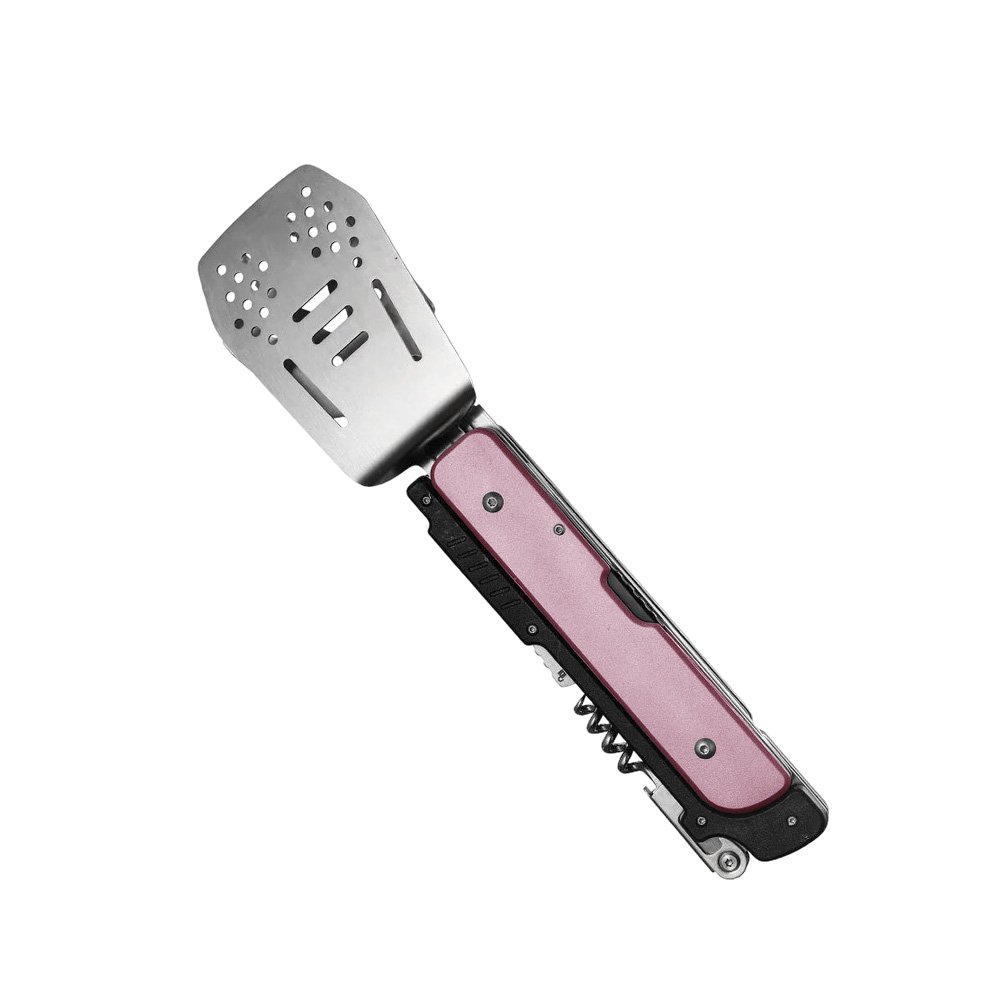 Непосредственно к ножу крепятся лопатка и вилка. Оба инструмента сделаны полностью металлическими, со складной ручкой. У вилки 4 зубчика с зазубринами, чтобы мясо не соскальзывало с нее. Есть отверстия для стекания жира. Такие же отверстия сделаны и на лопатке. Вилку с лопаткой можно соединить таким образом, чтобы они играли роль щипцов.