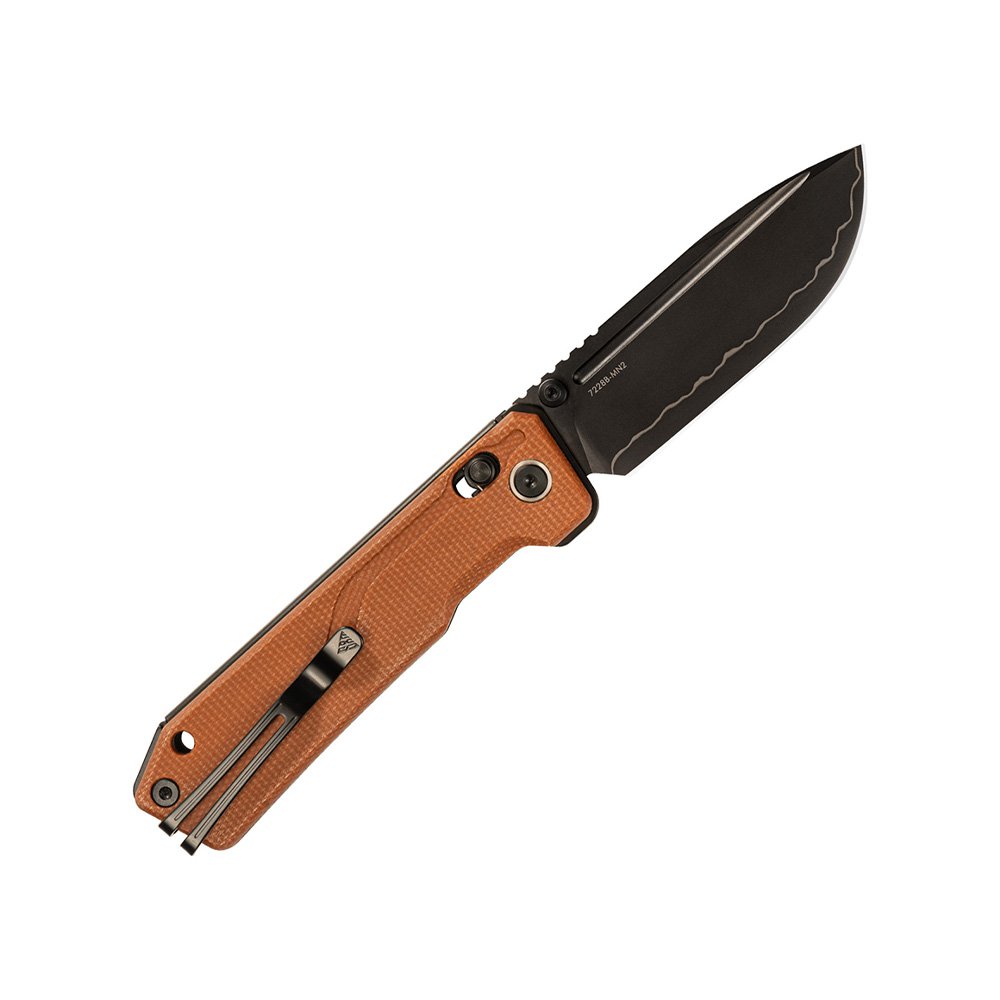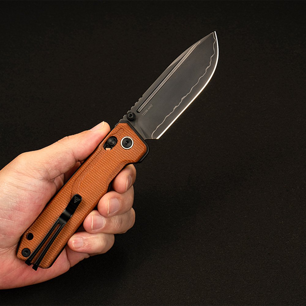 Клинок изготовлен из стали 140Cr, благодаря ламинированию двумя слоями других нержавеющих сталей, лезвие обладает характеристиками, сравнимыми со сталью S35VN. Твердость 61–63 HRC обеспечивает длительное удержание заточки, что гарантирует отличную износостойкость и долговечность, а черное покрытие PVD придаёт клинку тактический внешний вид и дополнительно повышает его стойкость к коррозии и износу.