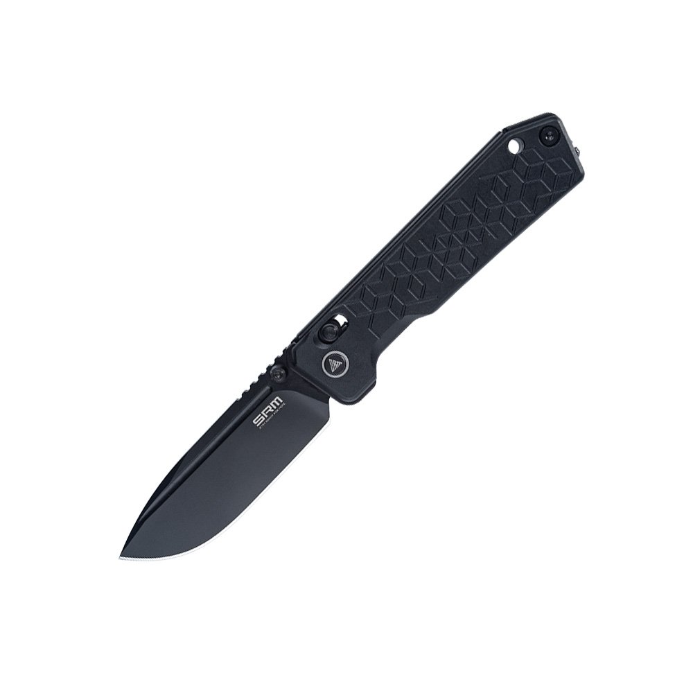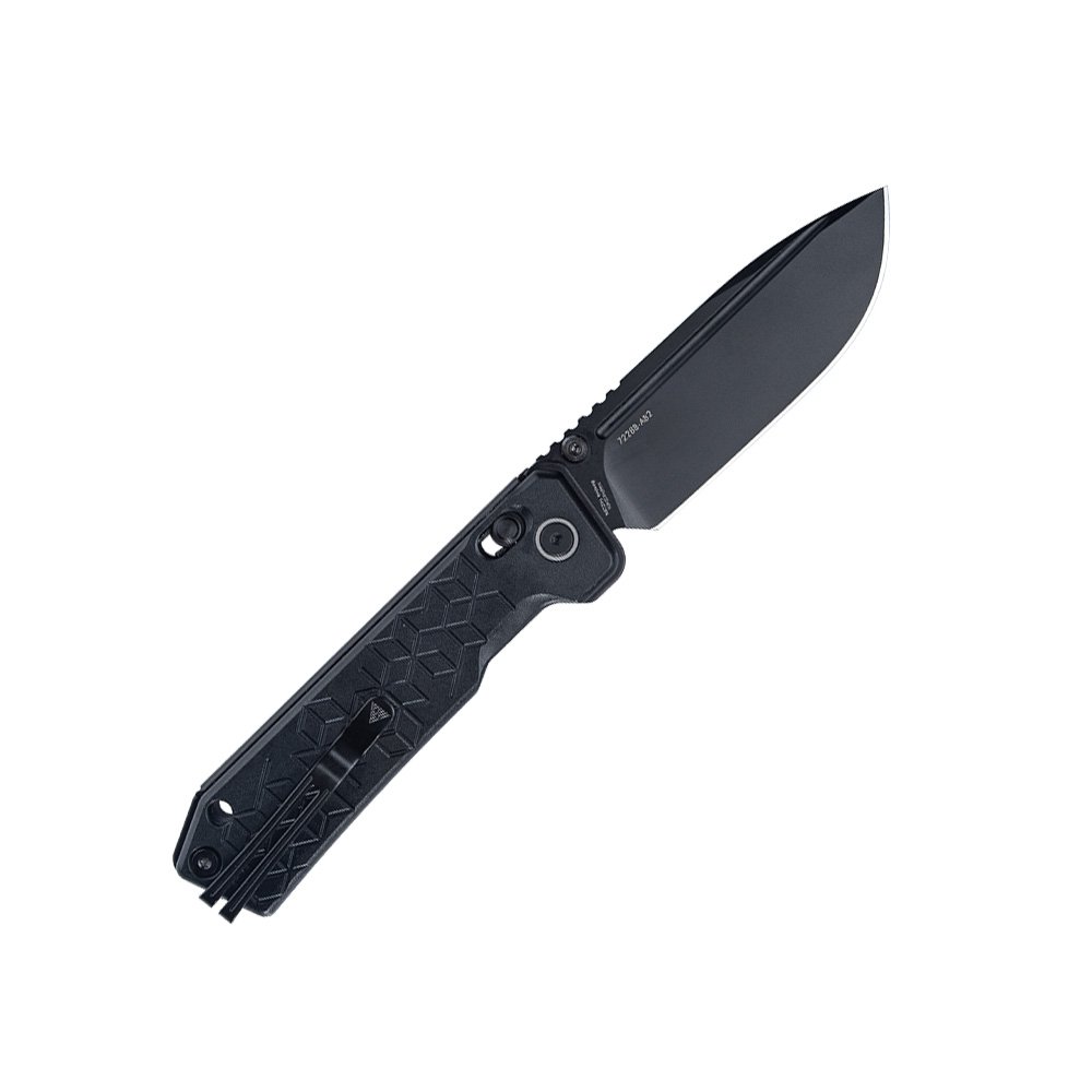 Клинок выполнен из нержавеющей стали Sandvik 14C28N с твёрдостью 57–59 HRC, что обеспечивает оптимальное удержание кромки и стойкость к коррозии. Благодаря технологии охлажденной заточки режущая кромка дольше сохраняет остроту и прочность. Черное матовое титановое покрытие придаёт клинку глубокий чёрный цвет с матовой текстурой, что делает нож менее заметным в использовании (например, для тактических задач) и повышает его износостойкость.