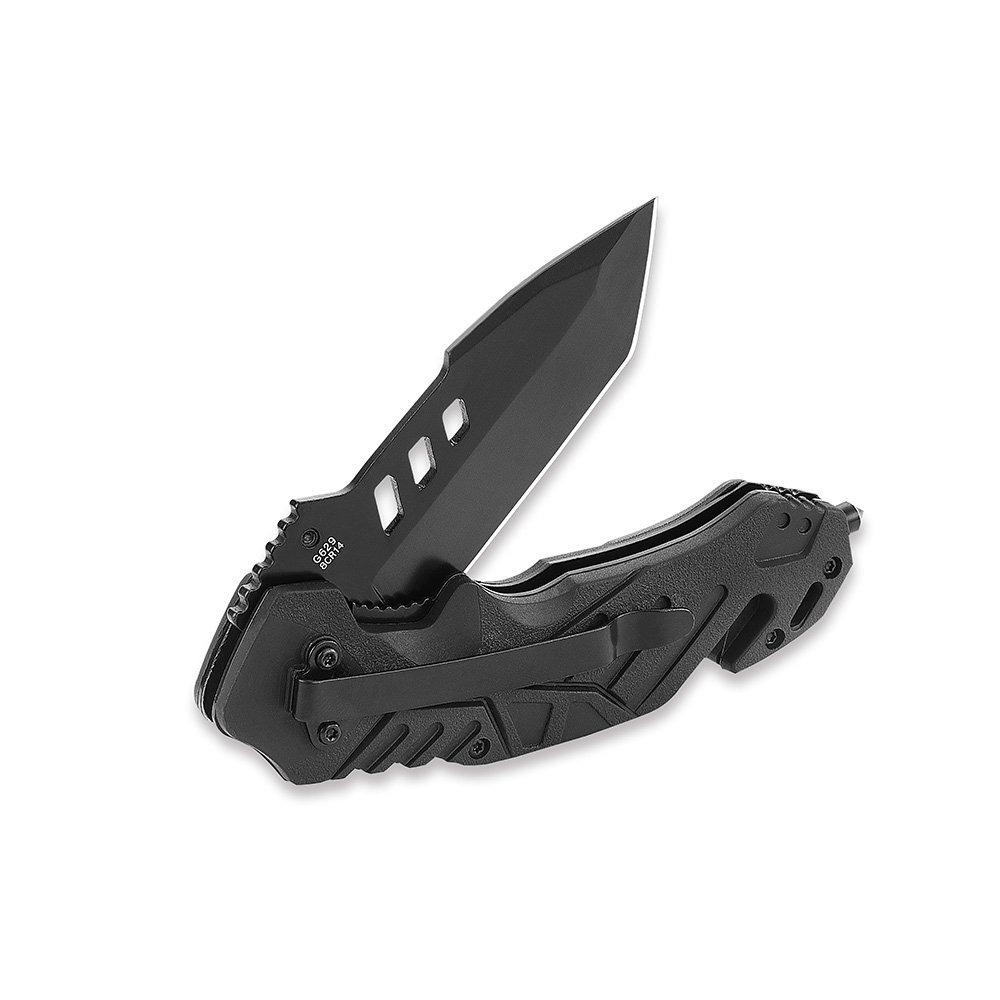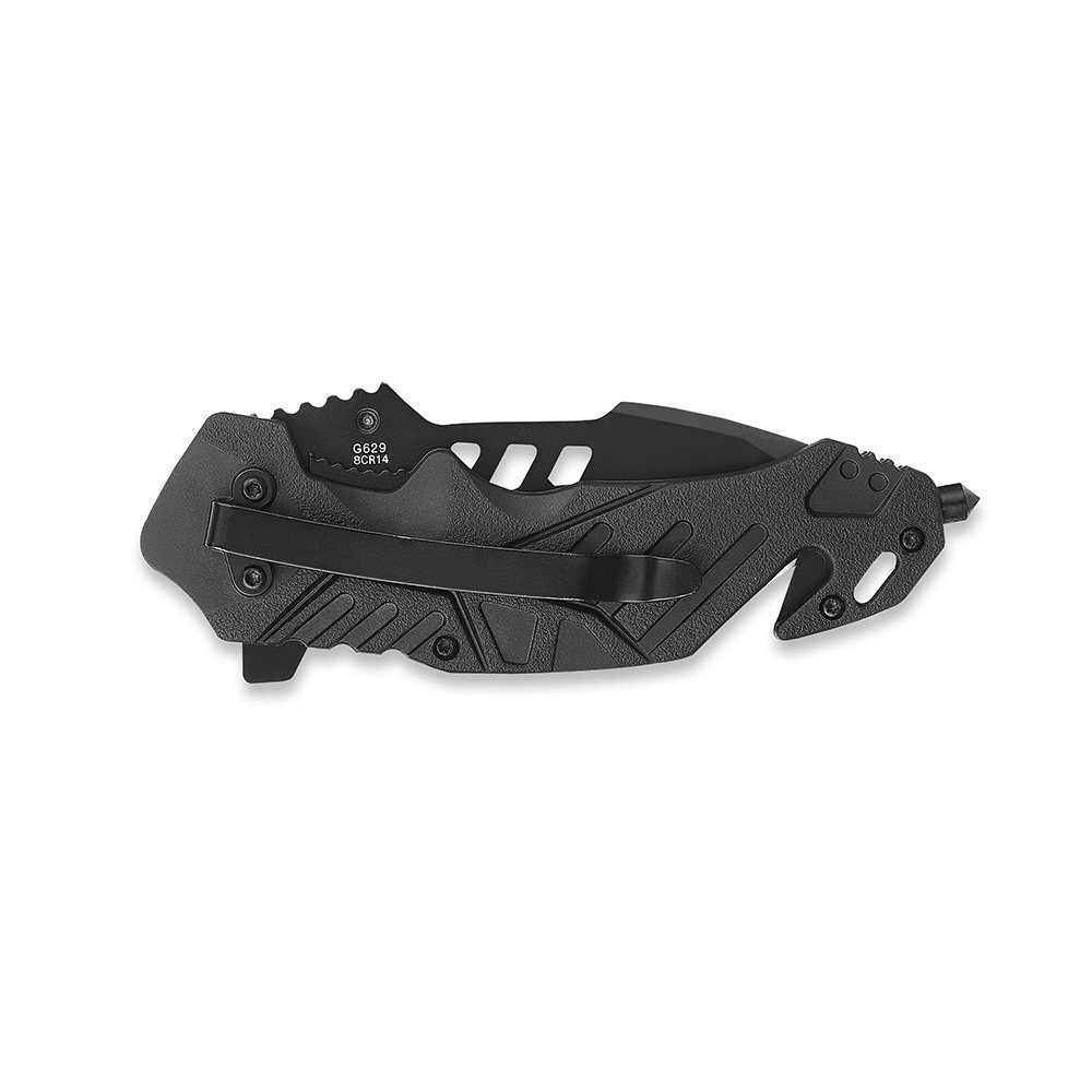 Дополнительные элементы конструкции включают стеклобой и стропорез — крайне полезные в чрезвычайных ситуациях. Также нож оснащен удобной металлической клипсой, которая позволяет закрепить его на поясе, кармане или снаряжении.