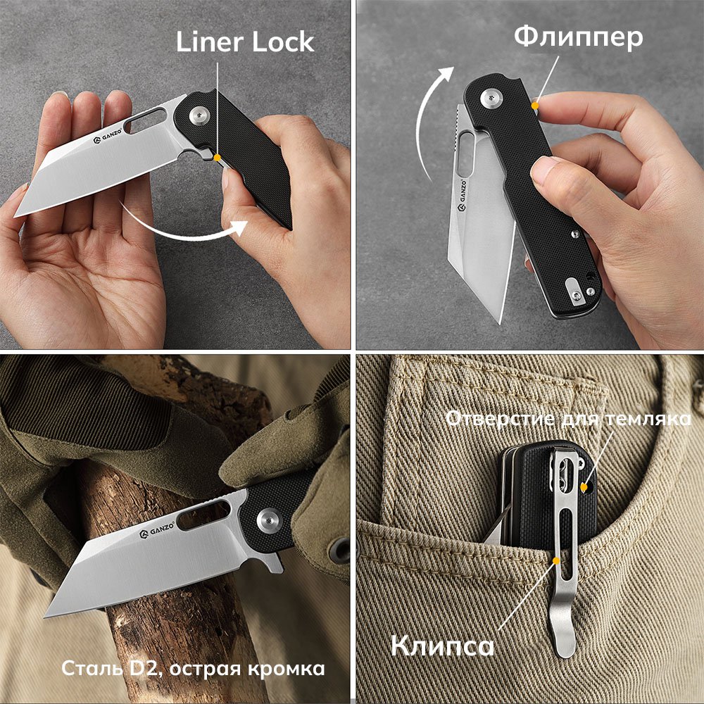 Кемпинговый нож Ganzo оснащен замком Liner Lock. Это простой и удобный механизм, который позволяет использовать нож одной рукой. Внутри конструкции скрыта подпружиненная пластина, которая надежно фиксирует лезвие в открытом положении, не позволяя ему закрыться во время работы. Для закрытия ножа необходимо надавить на пластину большим пальцем, позволяя ему сложиться.