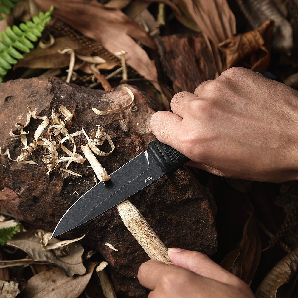 Рукоять туристического ножа G806BW-BK изготовлена из сочетания полипропилена (ПП) и термопластичной резины (ТПР). Этот материал легкий, стойкий к механическим повреждениям и химическим воздействиям, а текстурированная поверхность и форма рукоятки гарантируют надежный и комфортный хват даже во влажной среде. Нож фиксированный, что делает его особенно надежным при силовых нагрузках.