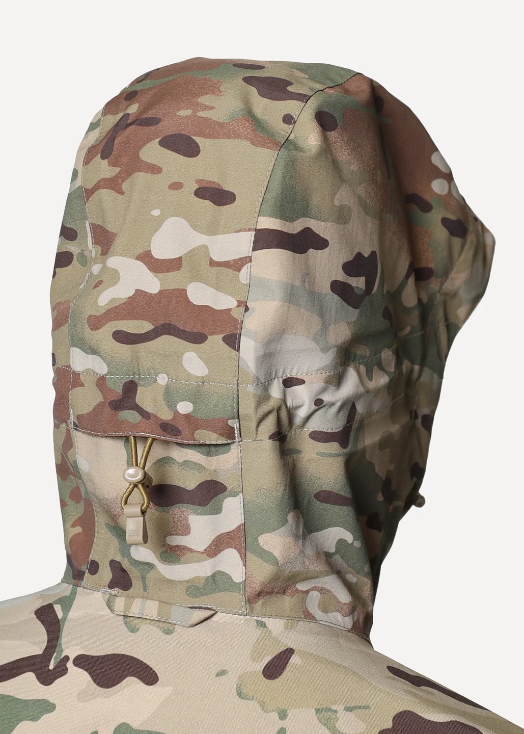 Воротник и капюшон представляют собой единое целое. Проклеенный козырек со вшитой жесткой пластиковой вставкой по краю для поддержания формы. Капюшон регулируется в двух измерениях эластичным шнуром с фиксаторами Duraflex®: утяжка вокруг лица и задняя утяжка вокруг головы. Сзади снаружи в основание воротника вшита вешалка.