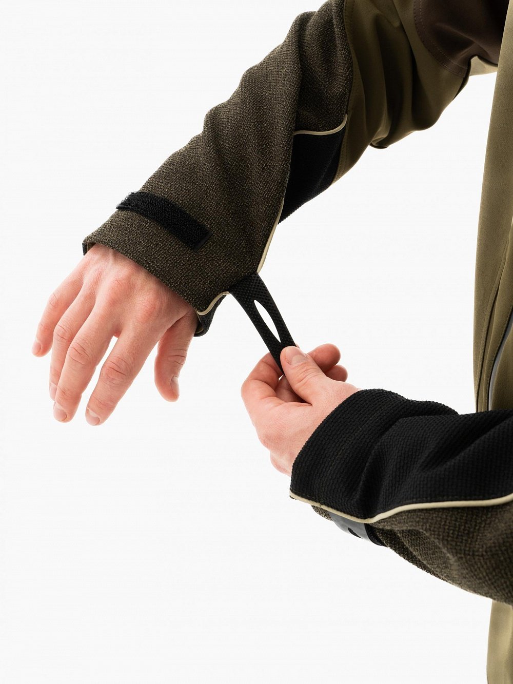 По низу куртки идет регулировка по объёму кулисой, рукав по объёму регулируется велкро, что позволит обеспечить лучшее прилегание и сохранение тепла.